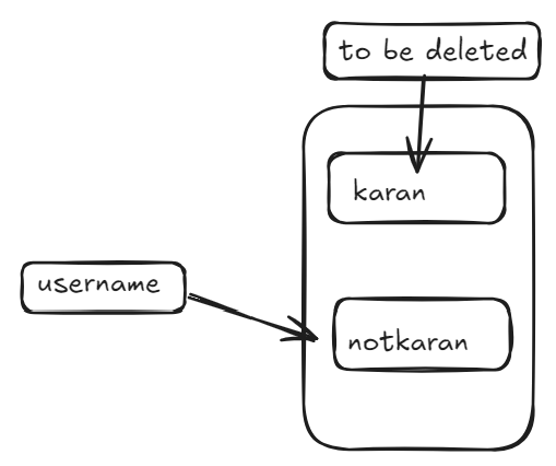 Here, the value "karan" is stored at a different memory location, which will be removed by the garbage collector in Python since no variable is referencing it.