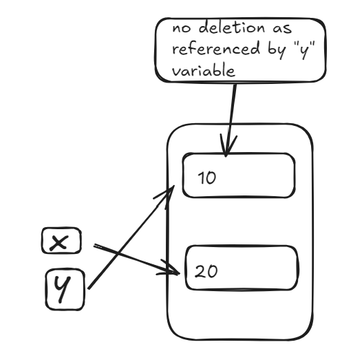 In this case, the value 10 won’t be deleted as it is being referenced by y.